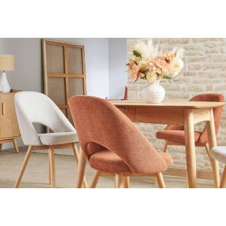 Apportez une touche de douceur nordique à votre intérieur avec le lot de deux chaises COSETTE, au design scandinave élégant. Le revêtement en tissu effet velours texturé beige offre un rendu chaleureux, raffiné et agréable au toucher, parfaitement mis en valeur par une structure en bois clair au look naturel et épuré. Leur dossier courbé et leur assise rembourrée assurent un excellent confort, que ce soit pour un repas en famille ou un moment de travail. Grâce à leur style intemporel et leur teinte neutre, ces chaises s’adaptent facilement à tout type d’intérieur, du plus minimaliste au plus contemporain.