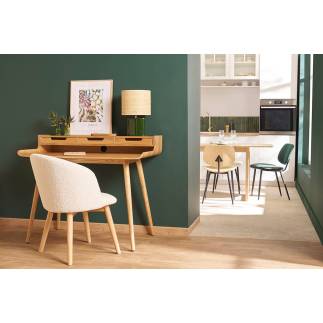 Le lot de deux chaises VANITY incarne à merveille l’esprit scandinave doux et chaleureux. Avec leur revêtement en tissu bouclette blanc cassé, ces chaises offrent un touché doux et cosy, parfait pour créer une ambiance apaisante dans la salle à manger ou un coin repas. Leur dossier courbé et leur assise généreusement rembourrée assurent un excellent confort, idéal pour de longs moments à table. Montées sur des pieds en bois clair (hêtre massif), elles affichent un style naturel et intemporel qui s’intègre facilement à tout type d’intérieur. À la fois élégantes, confortables et tendances, les chaises VANITY sont une belle invitation à la convivialité.